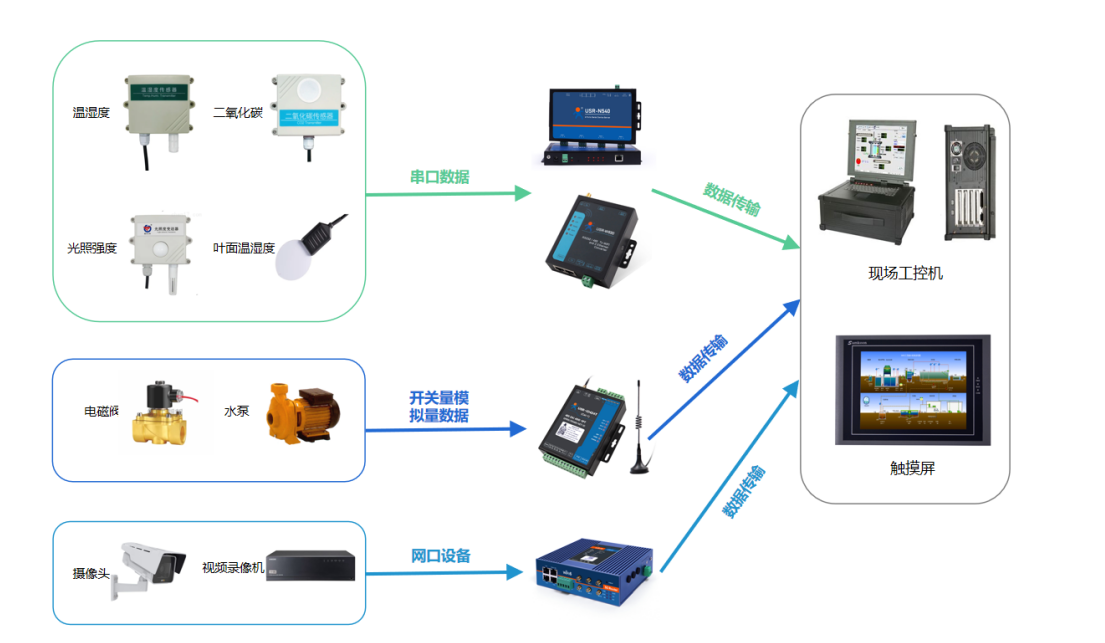 標準串口232、485、422、CAN,如光照傳感器、二氧化碳傳感器、土壤溫濕度等;