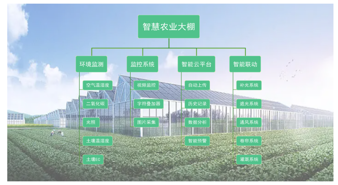 智慧大棚主要是檢測大棚內的數據,數據分析通過微電腦,電腦監控水幕、風扇、遮陽板等棚內設施,改變溫室內的生物生長環境,進而減少人工投入、提高作物產量、增加收益;