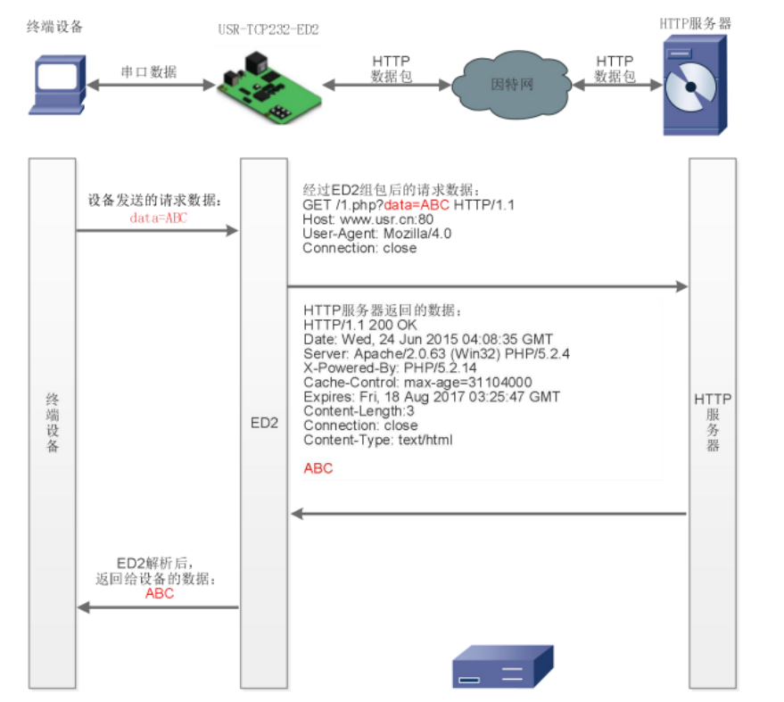 5. 打開串口發送數據,然后串口的數據就提交到你的網頁服務器上了,同時串口也會收到服務器回復的信息。6. 發送請求的具體信息可以參考“Httpd Client 模式說明”圖示,如下圖: