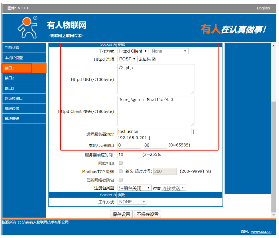 1. 通過網頁將 ED2 設置為 Httpd Client 模式,并設置相應的目標端口號和目標 IP/域名