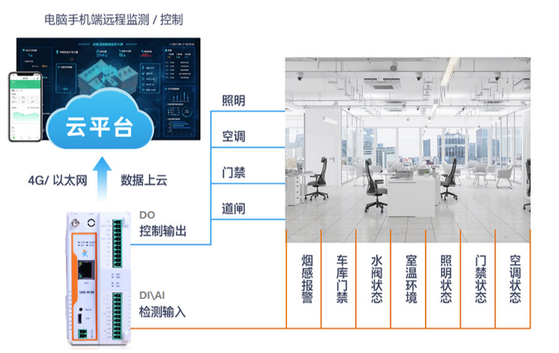 擴展:云平臺與M100均單獨擁有數據聯動功能,可通過PC端有人云“報警聯動”功能板塊或M100內置網頁“邊緣計算網關”板塊中配置DI/AI狀態控制DO的通斷。