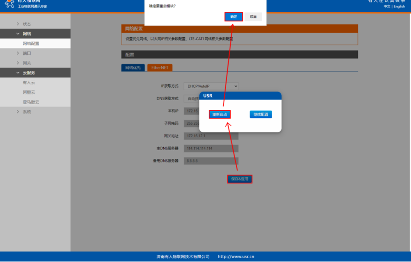 點擊“保存&應用”>“重新啟動”。(若M100使用sim卡上網,且不用M100網口上網的話,該步驟可不用配置,直接重啟設備便可以了。)