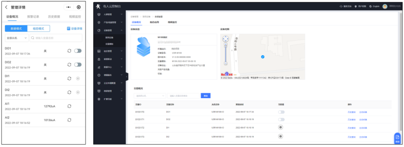 9、斷電重啟M100等待設備重啟聯網以后,在微信小程序與PC端有人云界面均可以看到設備上線,點擊設備名稱監控M100自身網絡IO狀態。