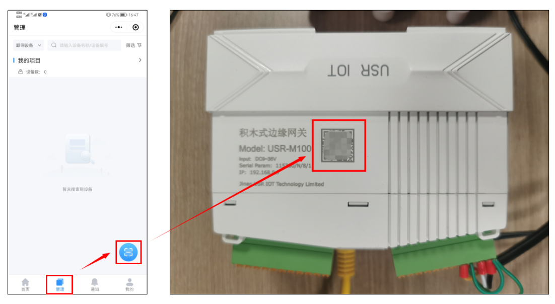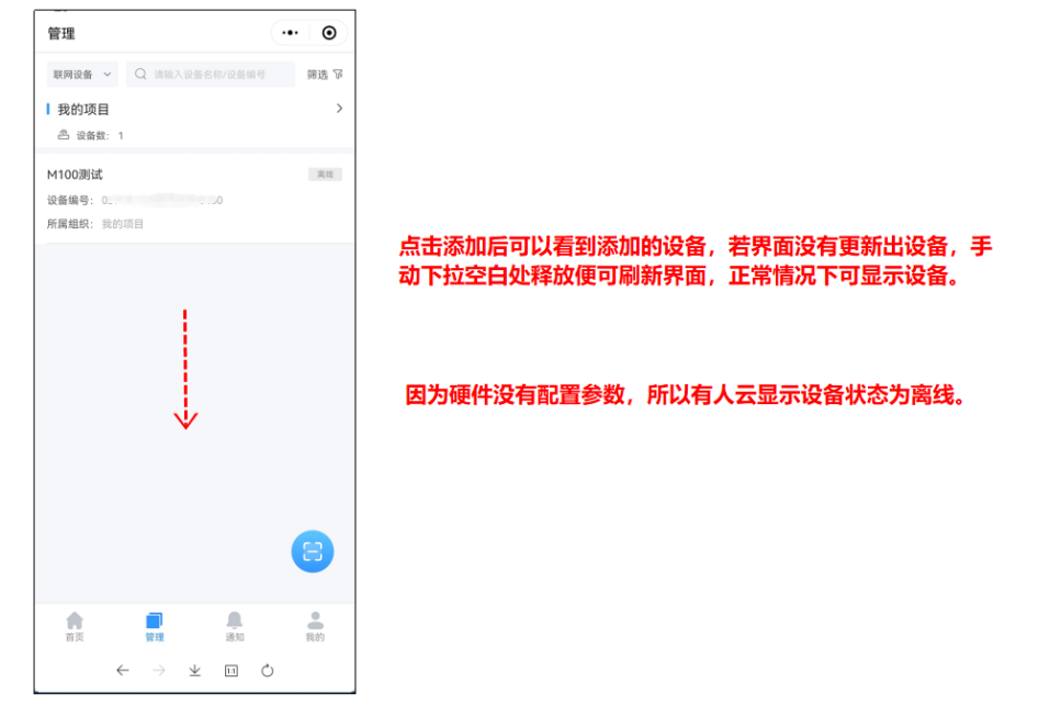 2、已有賬號可以打開手機微信,搜索小程序“有人云”,登入云賬號,在“管理”界面中點擊掃碼圖標,掃描M100殼體側面的二維碼。