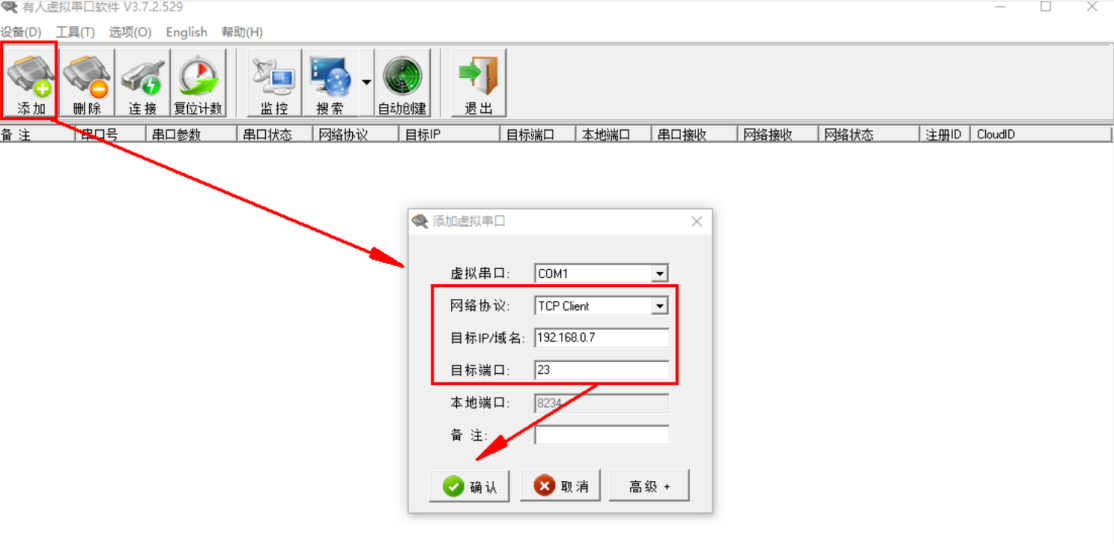 (1) 打開虛擬串口,設置點擊添加串口,選擇串口號為 COM1(選擇 COM 號一定要避開已經存在的 COM 口) 網絡協議選擇 TCP Client,目標域名/IP 設置成T0的IP,目標端口號設置為 T0的端口號,備注填寫自己的設備名稱