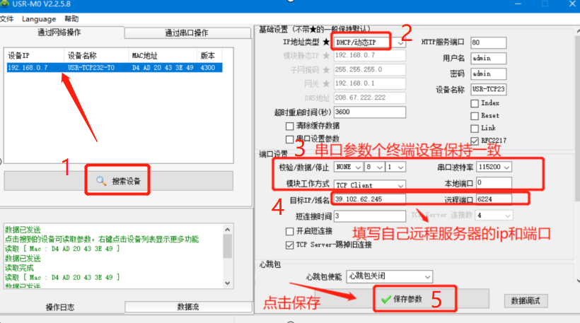 需要把T0模塊的ip改成DHCP獲取,或者改成與交換機同網段的靜態ip。把串口參數、ip端口填好后,點擊保存參數,才能生效。