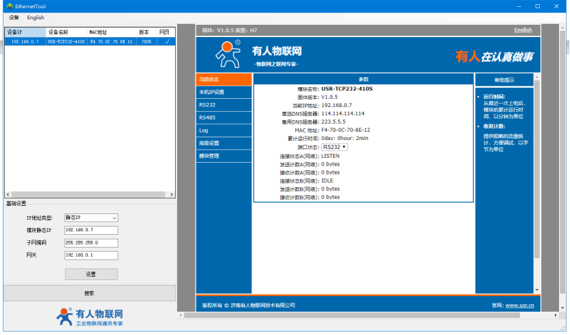 1.USR-TCP232-410s-H7 說明書http://www.0575400.com/Down/USR-TCP232-410s-H7-V1.0.1.pdf