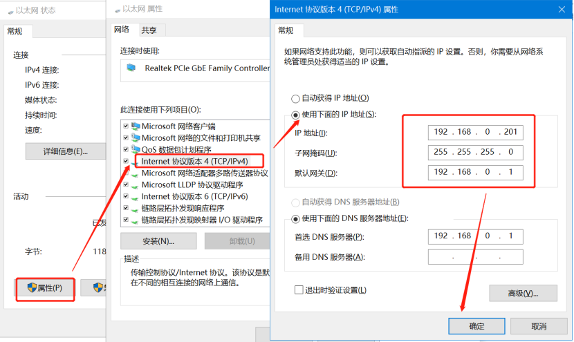 (2)電腦本地連接,關閉無關網(wǎng)卡,IP設置和E2 IP同網(wǎng)段,E2默認IP是192.168.0.7,網(wǎng)關192.168.1.1,電腦本地連接IPv4設置靜態(tài)IP,192.168.0.201,子網(wǎng)掩碼255.255.255.0,網(wǎng)關192.168.1.1