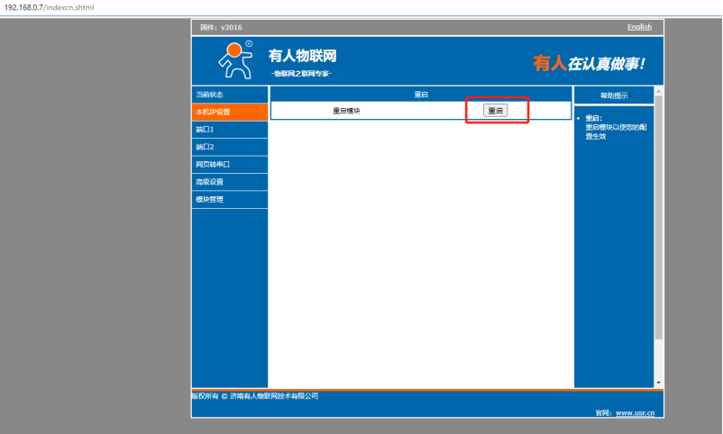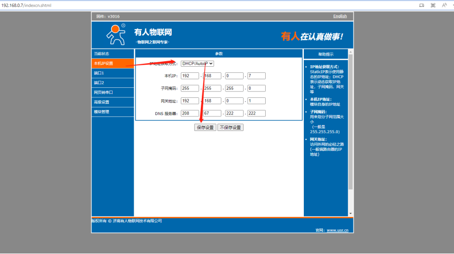 2、進入內(nèi)置網(wǎng)頁后,右上角可以切換至中文模式。點擊本機IP設置,IP地址獲取方式設置成DHCP,點擊保存設置,重啟模塊。