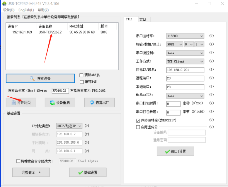1、用設置軟件搜索E2設備,點擊搜索設備,搜索到IP地址為192.168.0.7的E2設備后,選中設備,點擊 打開網(wǎng)頁,可以進入到E2的內(nèi)置網(wǎng)頁,默認用戶名admin,密碼admin。