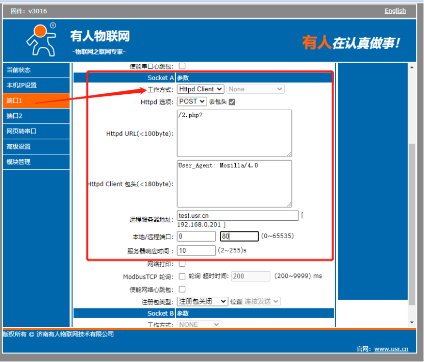 4、端口1工作方式設置HTTPD模式,POST,遠程服務器地址填test.usr.cn,遠程端口填80,本地端口號設置為0。URL填/2.php?,不濾除包頭。保存參數,重啟模塊。