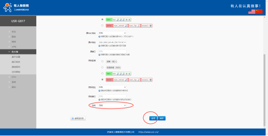 在目標(biāo)區(qū)域選擇 WAN,目標(biāo)地址填寫允許訪問(wèn)的 IP,動(dòng)作選擇“接受”設(shè)置完成后,點(diǎn)擊“應(yīng)用”。