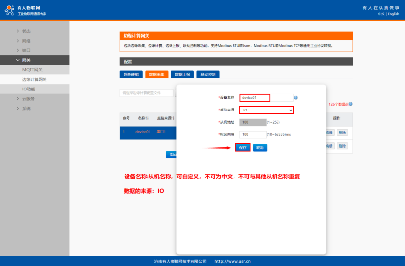 在“網關”-“邊緣計算”界面中開啟網關使能,點擊“下一步”在“數據采集界面”配置IO的數據點。