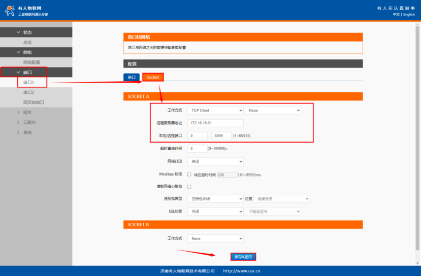 本案例測試服務器為我司 TCP服務器測試,用戶測試時請在“端口”>“串口1” >“ Socket”界面配置自己TCP服務器的參數。