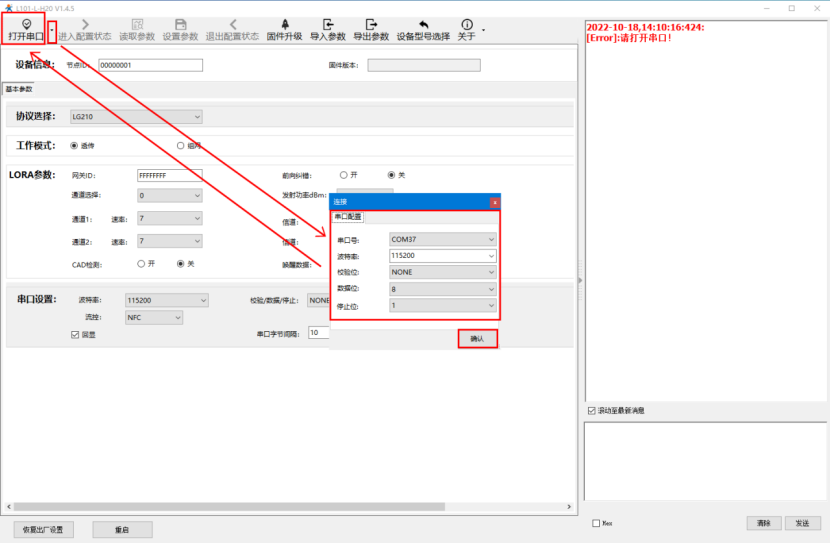 7、配置WH-L101-L-H20,L101的串口線接電腦,lora設(shè)置軟件選擇產(chǎn)品型號對應(yīng)lora型號,點擊確認,打開對應(yīng)串口的com號,串口參數(shù)默認是115200、none\8\1。