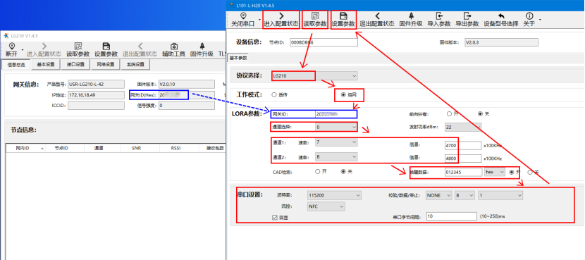 將協(xié)議選擇配置為“LG210”,工作模式配置為“組網(wǎng)”,LORA參數(shù) - 網(wǎng)關(guān)ID配置為LG210的網(wǎng)關(guān)ID;