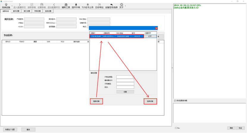 2、下載并解壓LORA設(shè)置軟件,確認LG210網(wǎng)口接入路由器網(wǎng)絡(luò)是與電腦在同一局域網(wǎng)內(nèi)。在文件夾中選擇USR_LoRa.exe可執(zhí)行文件雙擊打開,協(xié)議選擇私有協(xié)議,型號選擇LG210,點擊“連接設(shè)備”按鈕旁的下三角箭頭,選擇“網(wǎng)絡(luò)連接”>“搜索設(shè)備”>選擇對應(yīng)LG210點擊“選擇設(shè)備”。
