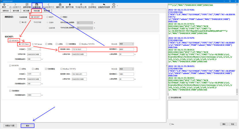 在SOCKET中選擇“TCP Clinet”,本地端口自定義.