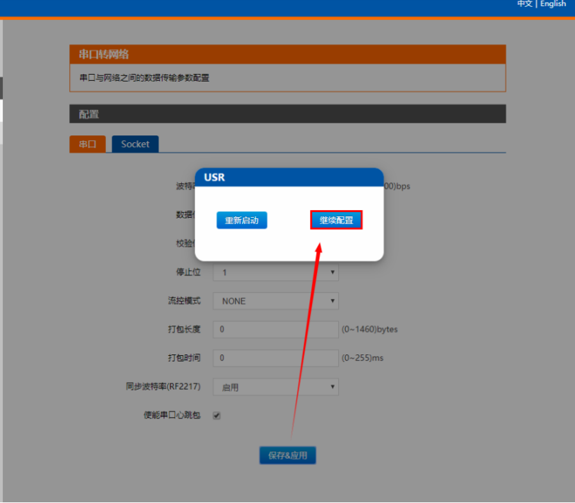 串口波特率/檢驗位/數據位/停止位修改與串口設備的串口參數一致,默認為115200波特率,無校驗位(NOEN)數據位8,停止位1。點擊繼續配置。