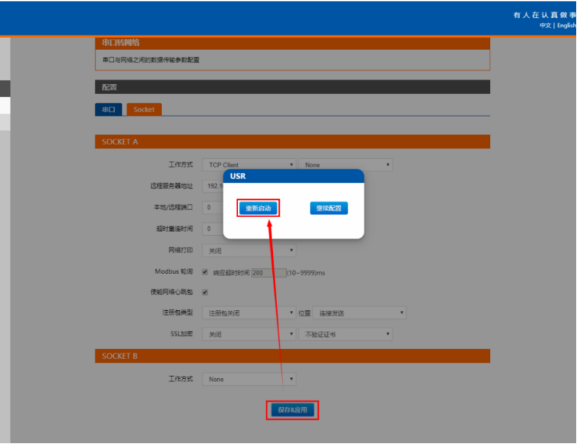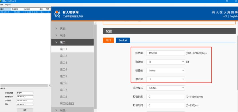 在“端口”>“端口1”界面中的“Socket”配置Socket A的工作模式為“TCP Client”
