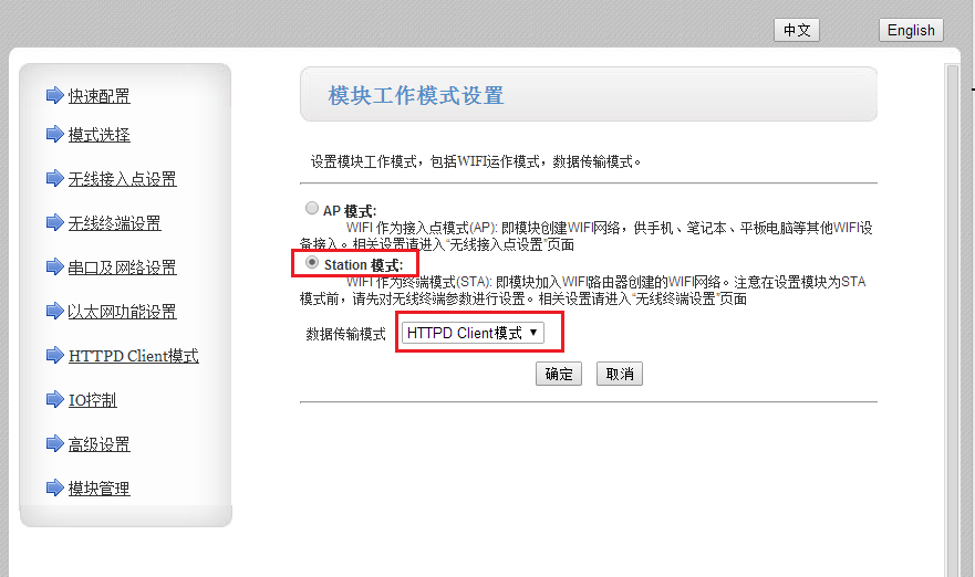 WiFi模塊設(shè)置為STA模式,傳輸模式為HTTPD Client。