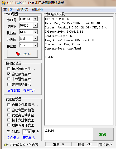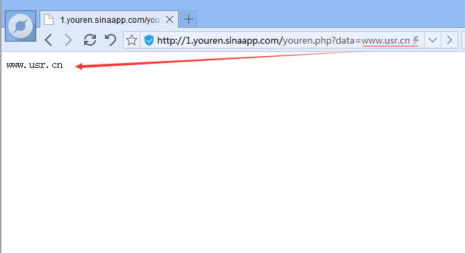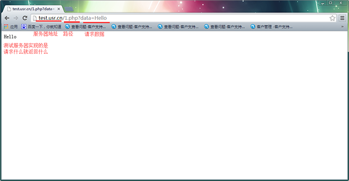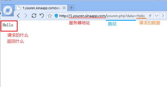 在瀏覽器上輸入http://1.youren.sinaapp.com/youren.php?data=Hello ,請(qǐng)求地址和路徑要與以上HTTPD_Client統(tǒng)一匹配。