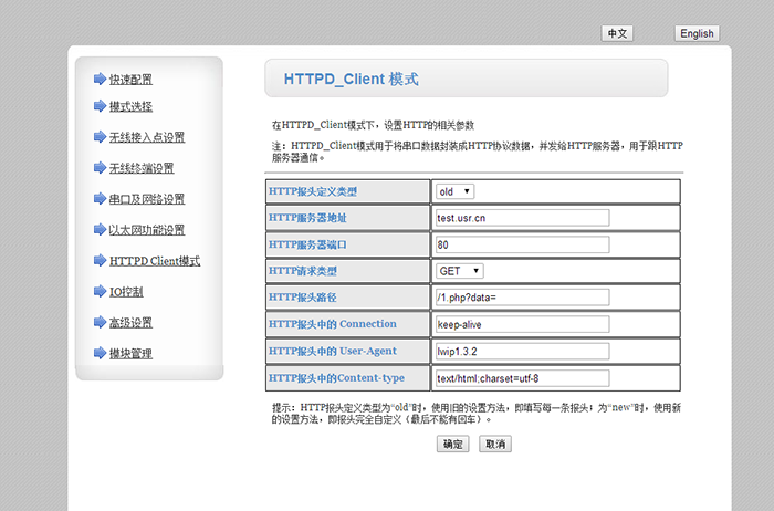 1:HTTPD_Client主要應(yīng)用于網(wǎng)頁(yè)服務(wù)器,WiFi模塊發(fā)送的數(shù)據(jù),可以透?jìng)鞯骄W(wǎng)頁(yè)服務(wù)器接收。網(wǎng)頁(yè)服務(wù)器返回?cái)?shù)據(jù)給WiFi模塊的串口。用于監(jiān)控串口設(shè)備。
