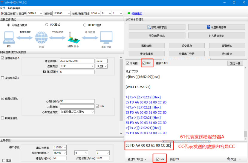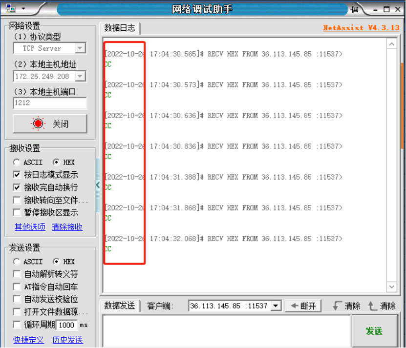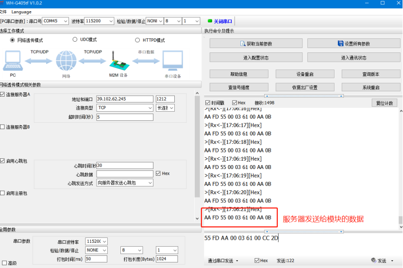 4>重啟后,模塊會主動連接服務器,通過串口發送指定格式的數據出去。