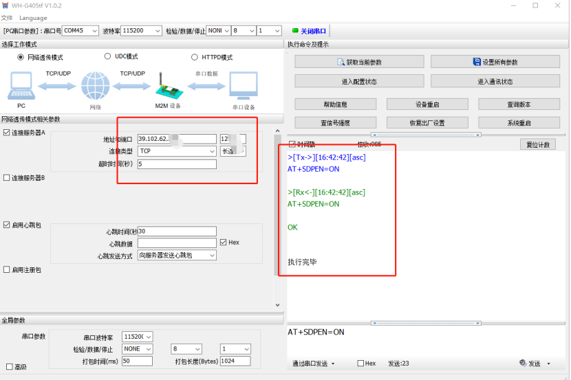 3>使能socket套接字分發功能:發送AT+SDPEN=ON(AT指令后需要加回車換行),設置連接的服務器地址和端口號,然后重啟設備使設置生效。