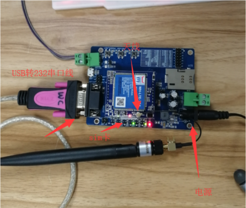 將4G模塊USR-LTE-7S4 V2安裝在測試底板上,安裝上天線,,正確放入SIM卡,使用USB轉RS232的串口線(公頭)與測試底板連接。