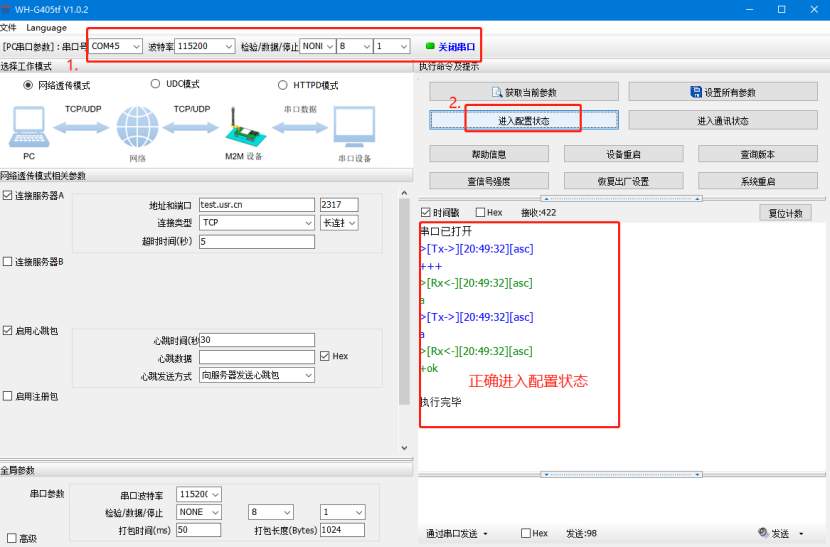 注:點擊進入配置狀態,如果模塊能返回+ok的字符,說明電腦和模塊連接是沒有問題的