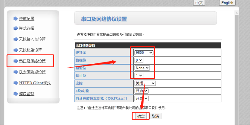 3)在串口及網(wǎng)絡設(shè)置,波特率等參數(shù)修改成和要接的串口設(shè)備一致。(這里測試修改成9600),點擊確定。工作模式設(shè)置TCP server,設(shè)置本地端口:5566,點擊確定。