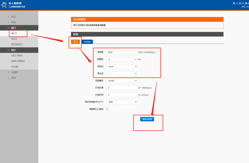 7、配置串口的波特率、校驗位、數據位等串口參數和要接的485設備一致(此處用9600為例),點擊保存應用-繼續配置。
