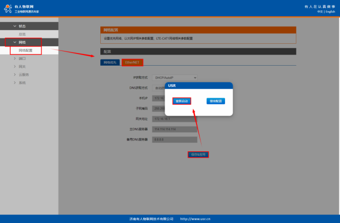 8、若需要修改M100 IP, 使用工具重新搜索設備,點擊進入配置界面,在 網絡 - 網絡配置 - EtherNET 界面中自行修改設備網口ip獲取方式,然后M100通過網口接入路由器上網。