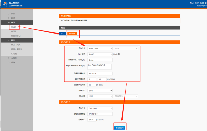 本案例測試服務器為我司 HTTP服務器測試,用戶測試時請在“端口”>“串口1” >“ Socket”界面配置自己HTTP服務器的參數。