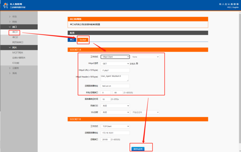本案例測(cè)試服務(wù)器為我司 HTTP服務(wù)器測(cè)試,用戶(hù)測(cè)試時(shí)請(qǐng)?jiān)凇岸丝凇?gt;“串口1” >“ Socket”界面配置自己HTTP服務(wù)器的參數(shù)。