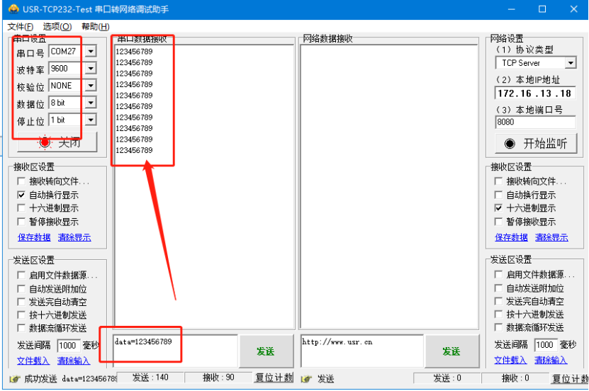 9. 電腦識(shí)別到M100的串口,用test軟件打開(kāi),串口端實(shí)現(xiàn)自發(fā)自收。