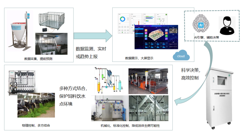 3、飲水點監測:監測飲水點水質、水壓、水溫等飲用水相關參數,確保養殖活體可以正常飲水。減少動物生病的機會,減少藥物使用,提高禽肉的質量。更是降低了牲畜死亡率、養殖成本負擔、繁殖風險