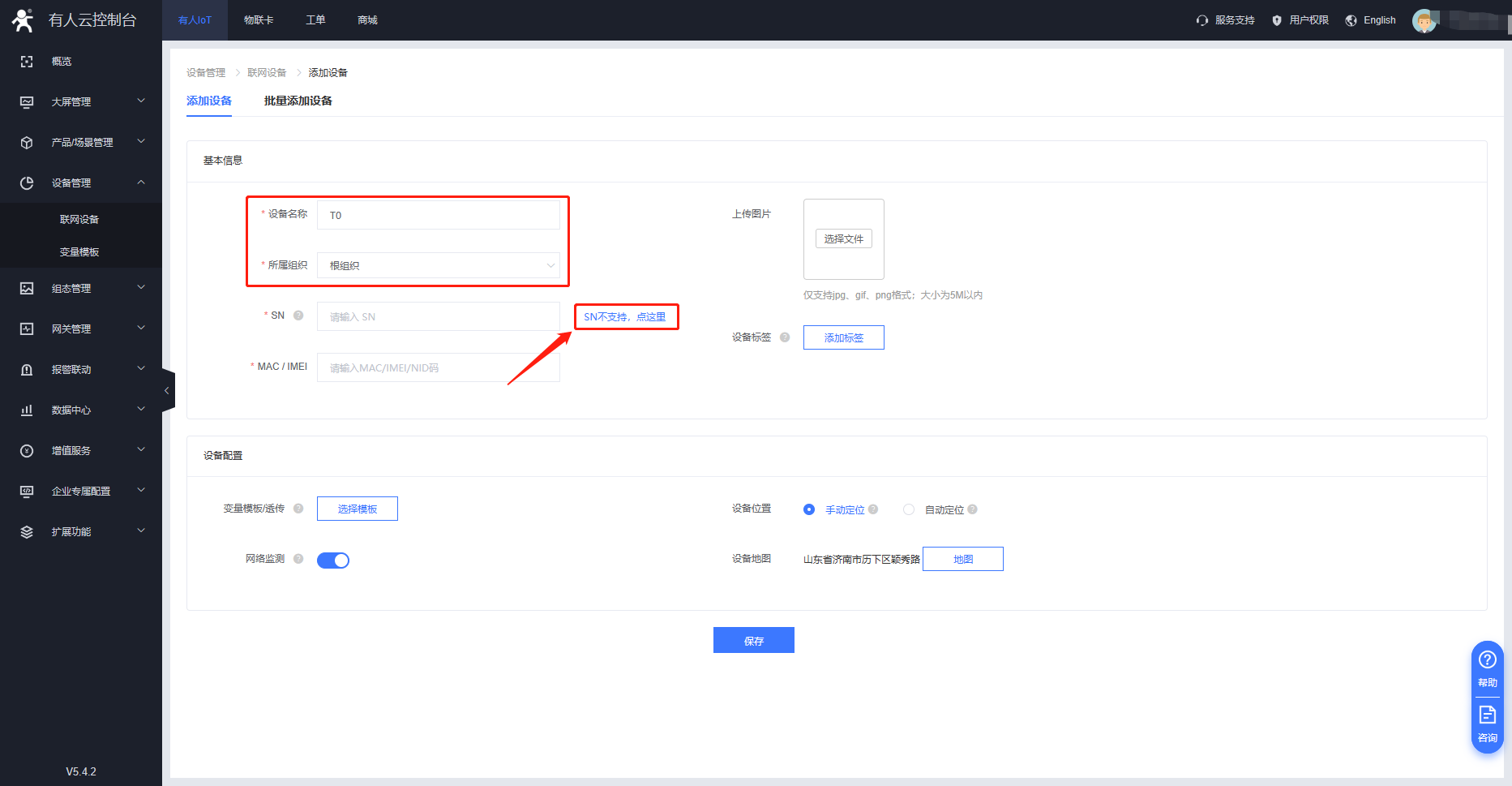 2)T0目前不支持SN碼添加,點擊右側“沒有SN,點這里”,設備ID和通訊密碼可以自動生成,設備ID20位,通訊密碼必須是8位(支持修改密碼)。