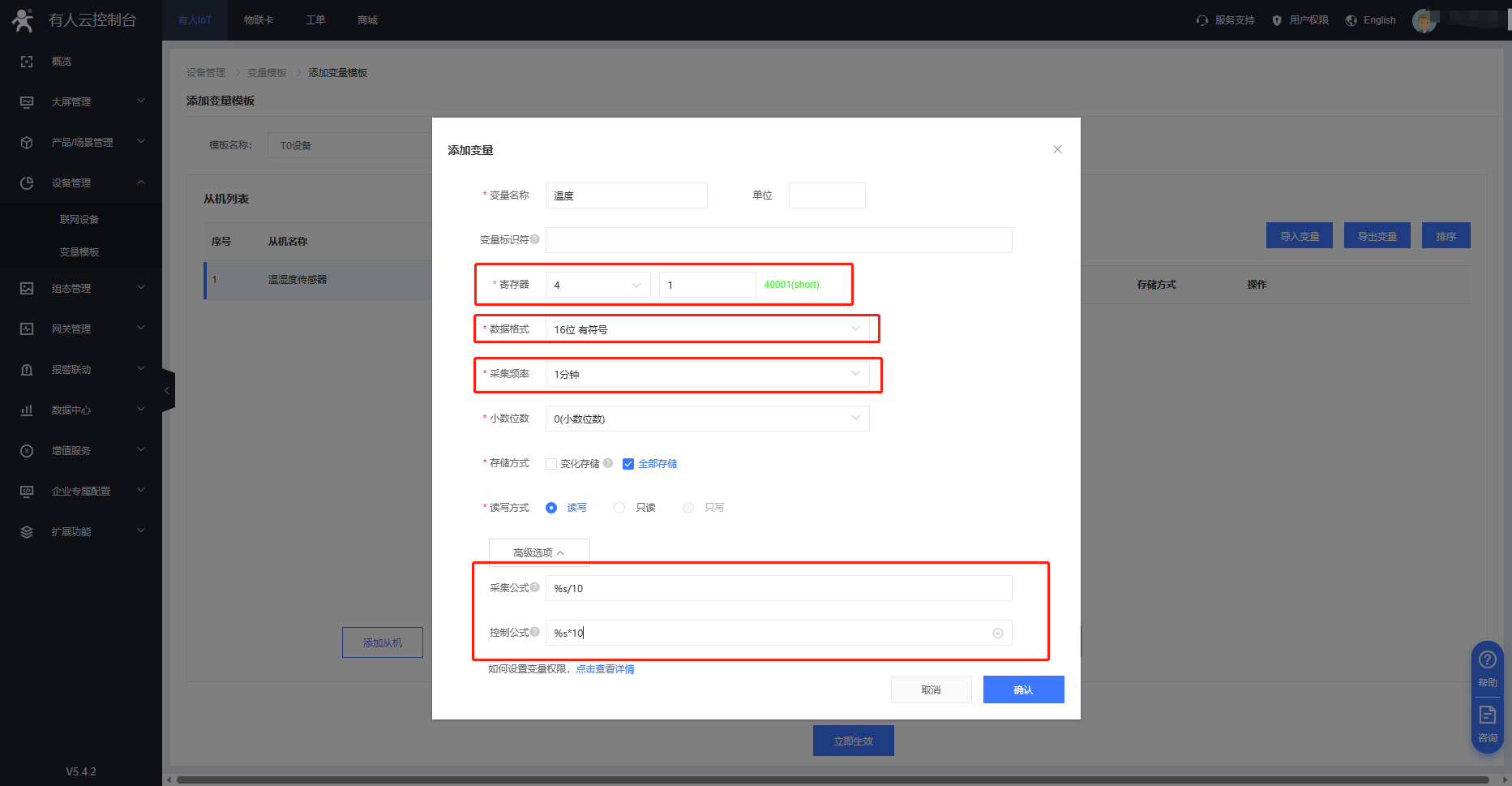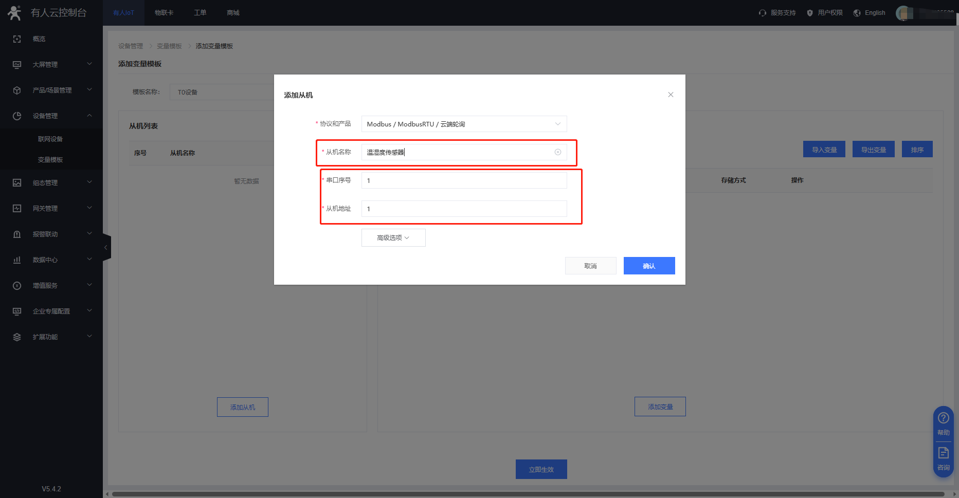3、有人云平臺選擇云端采集MODBUS RTU,填寫正確的從機地址(設備號)、功能碼和寄存器地址與設備真實寄存器地址是否一致