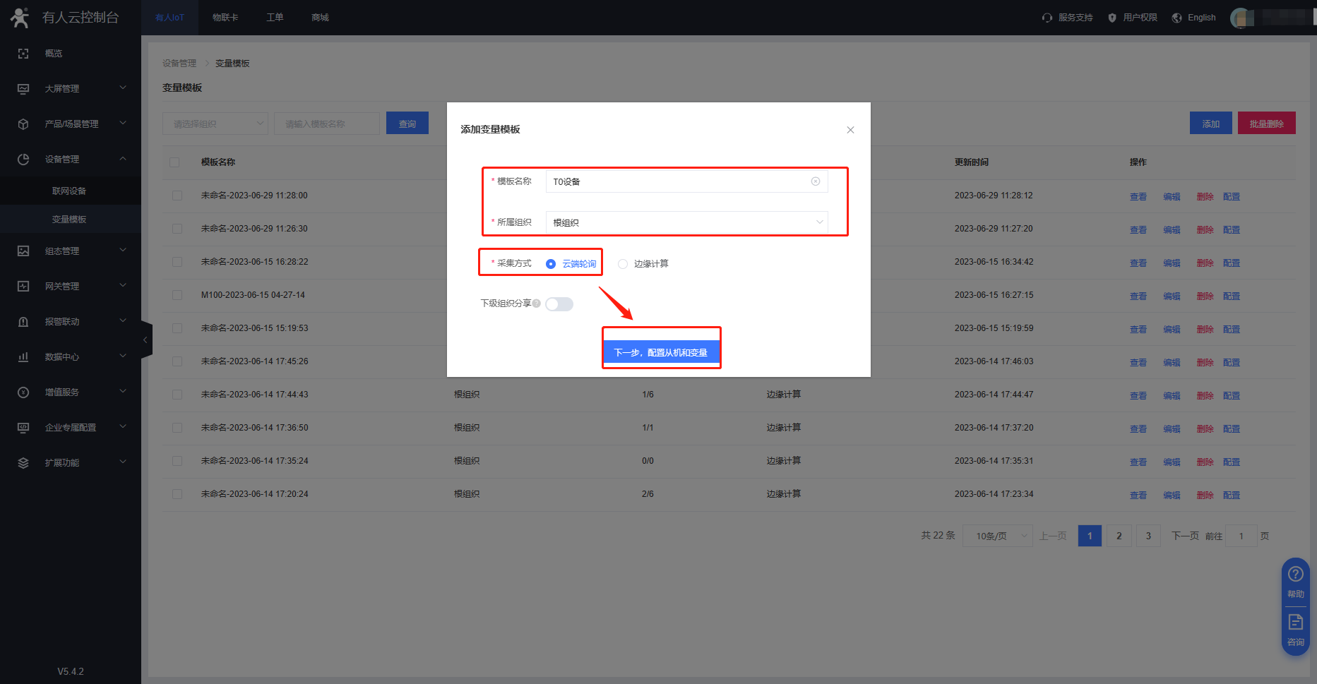 1)點擊“添加”,采集方式選擇“云端輪詢”,模板名稱可以自定義,點擊“下一步,配置從機和變量”