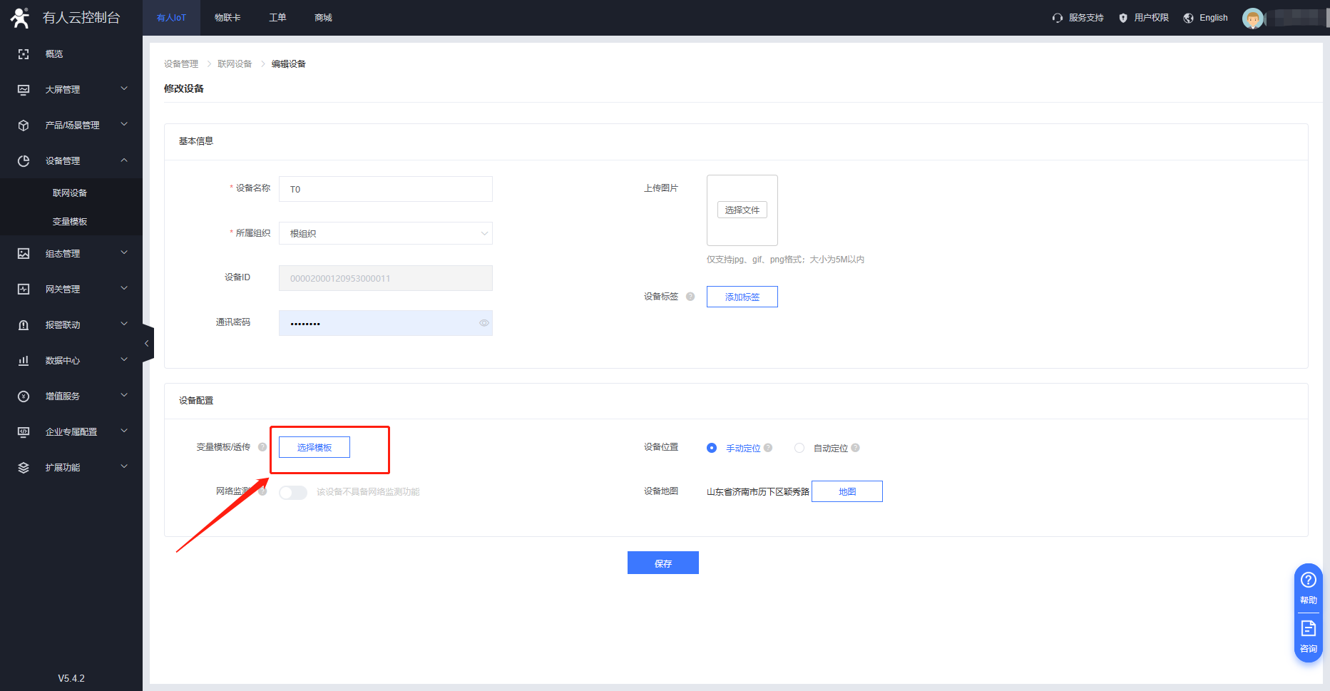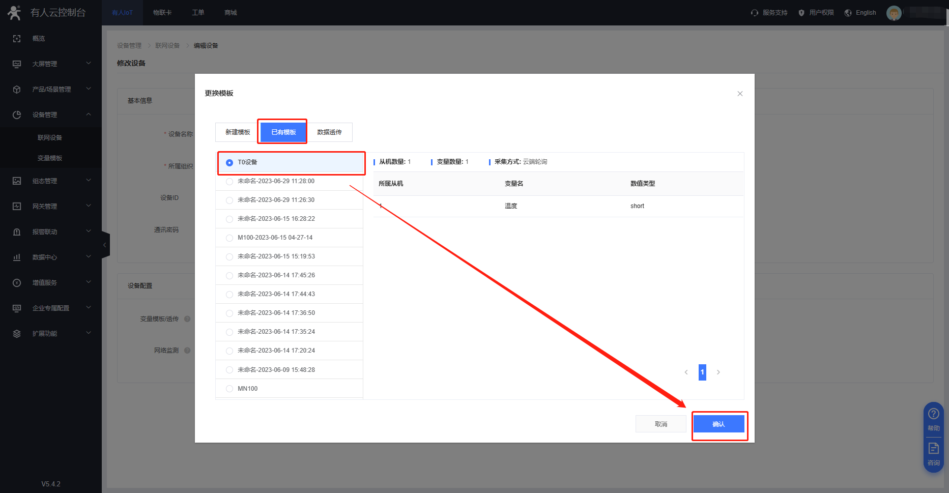 4.打開剛剛添加的設備,點擊“編輯”,點擊“選擇模板”,然后確定,在“已有模板”里選擇剛剛創建的模板,確定添加后保存