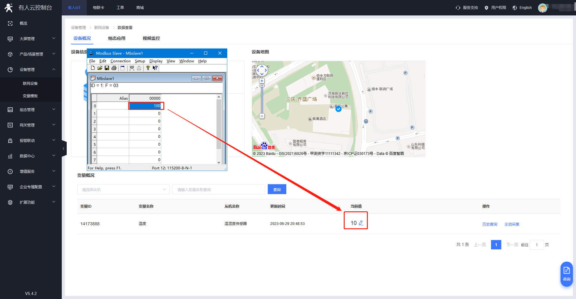 云端下發采集指令,modbus slave模擬串口設備上傳數據