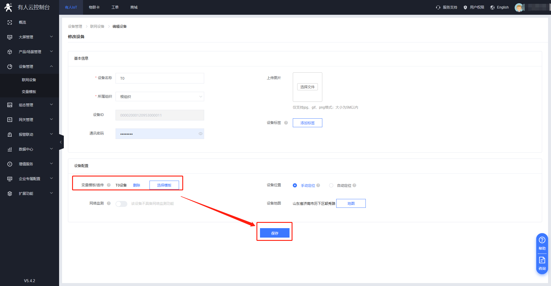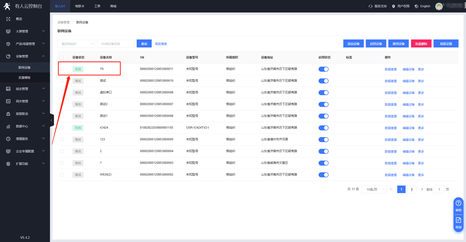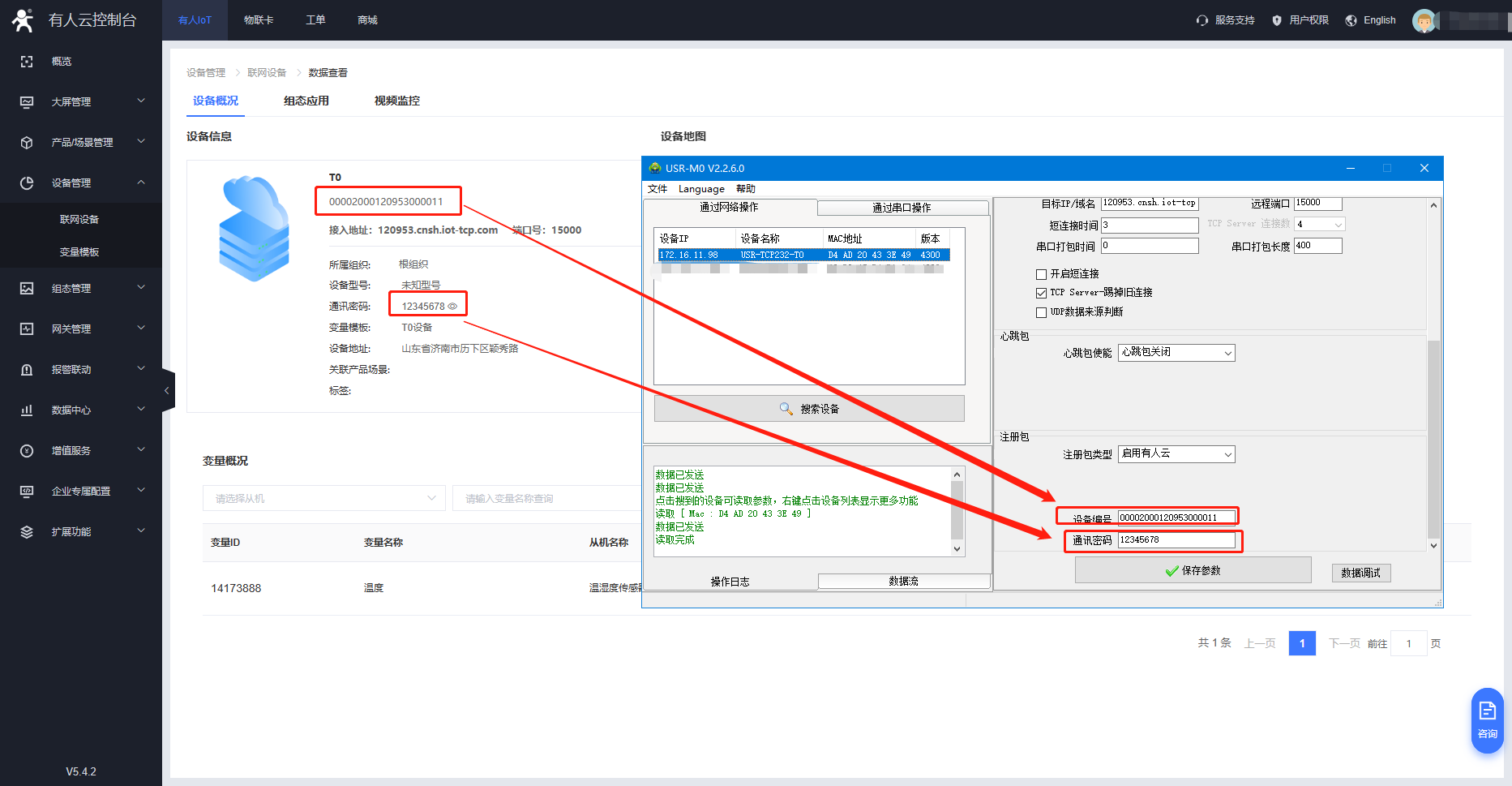 3.T0正常聯網,參數設置正確,此時可以看到有人云設備已經上線