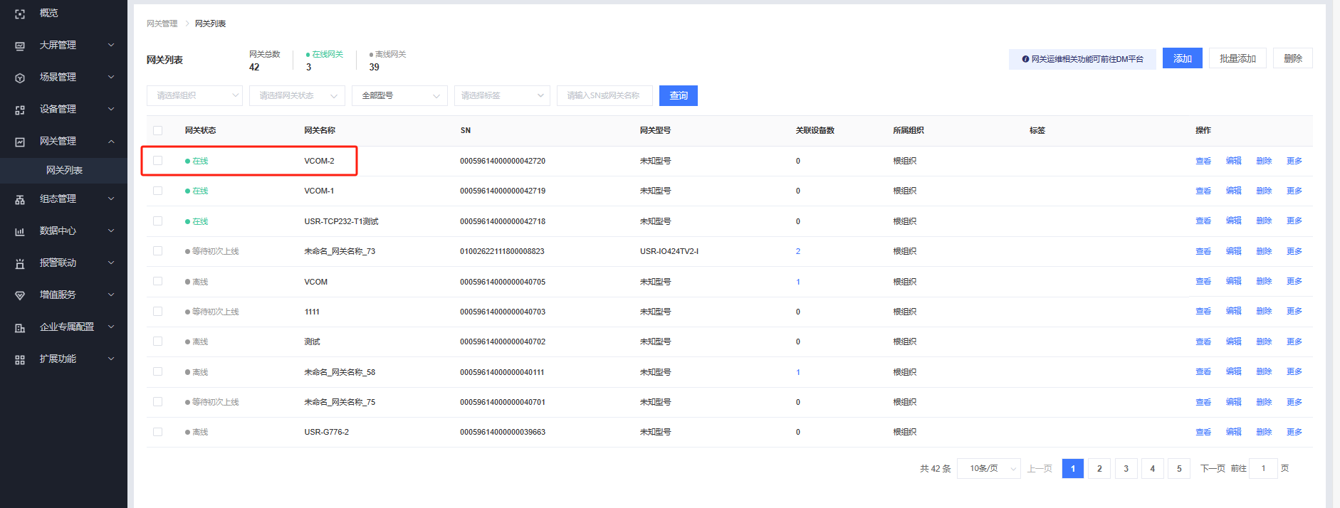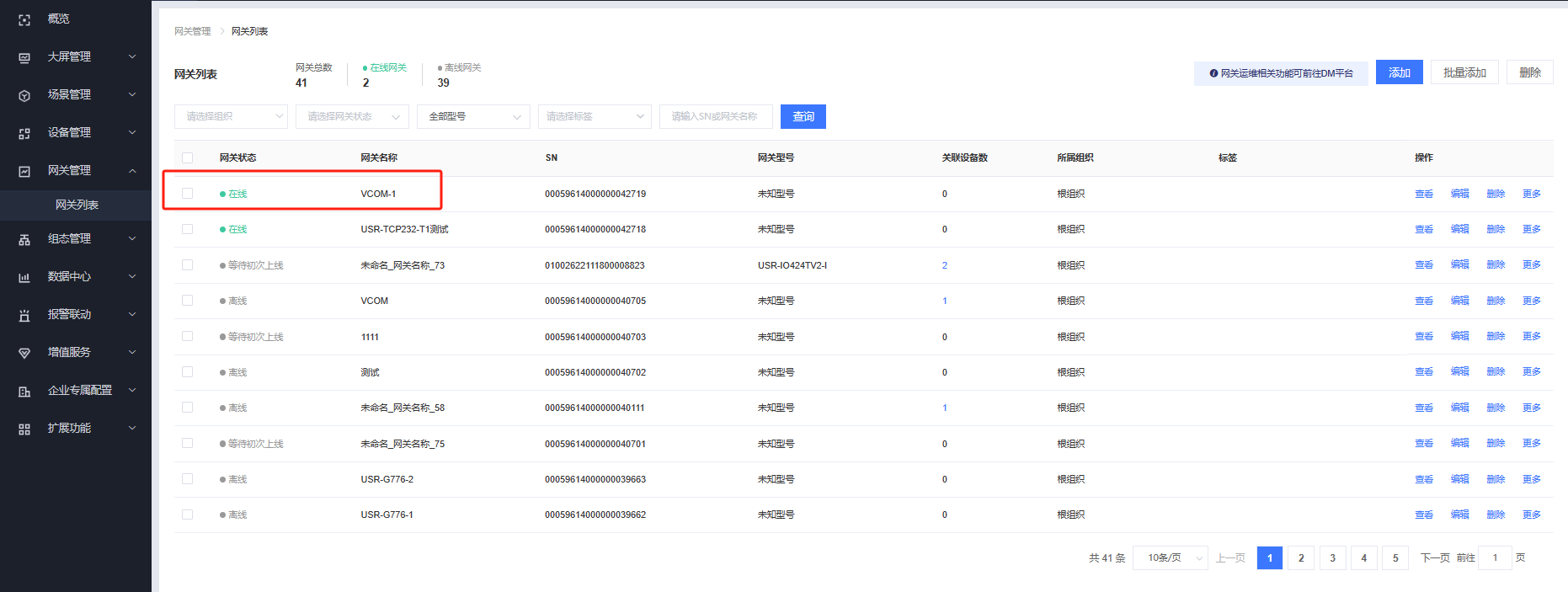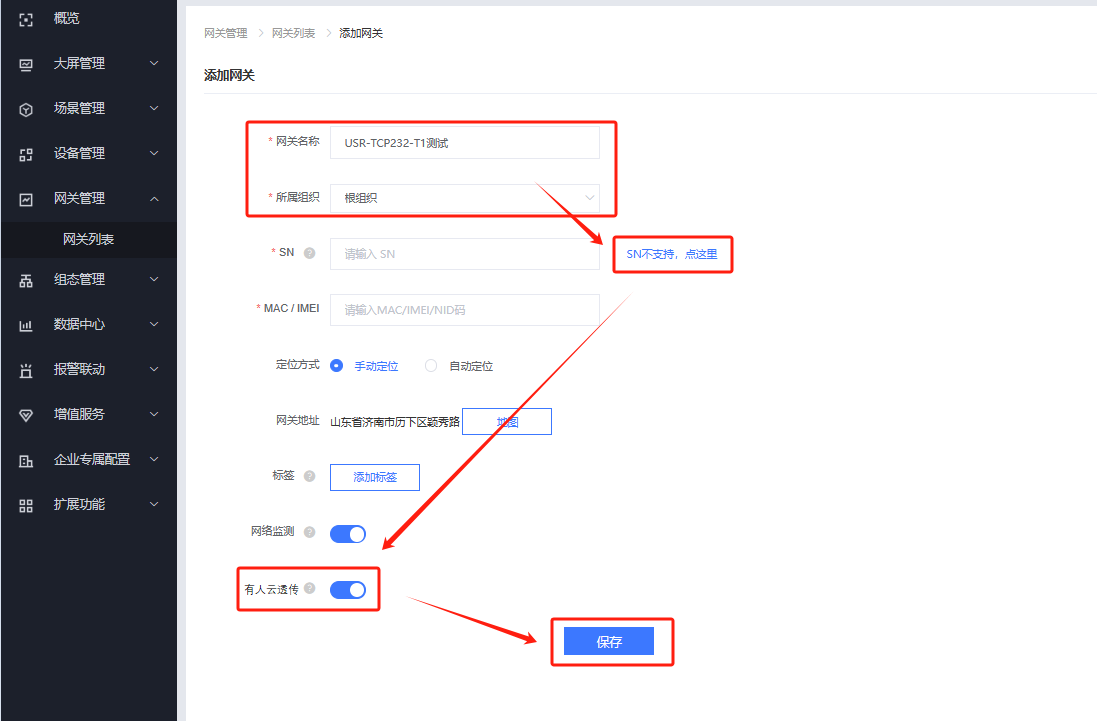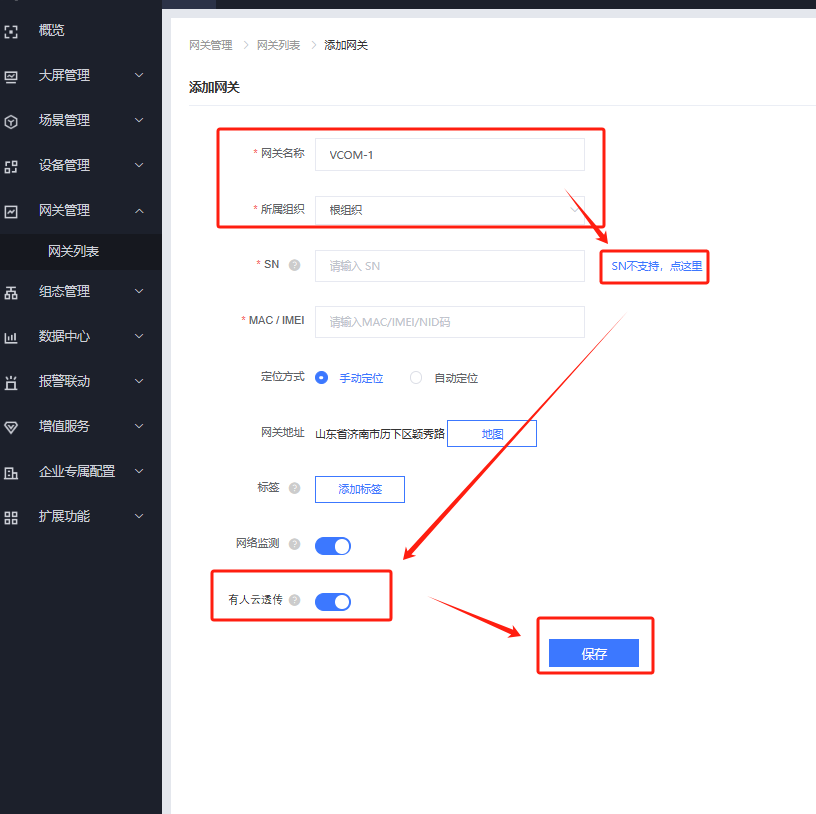 有人云--網關管理--網關列表--添加:VCOM-1,根組織,“SN不支持,點這里”,開啟有人云透傳,點擊保存即可