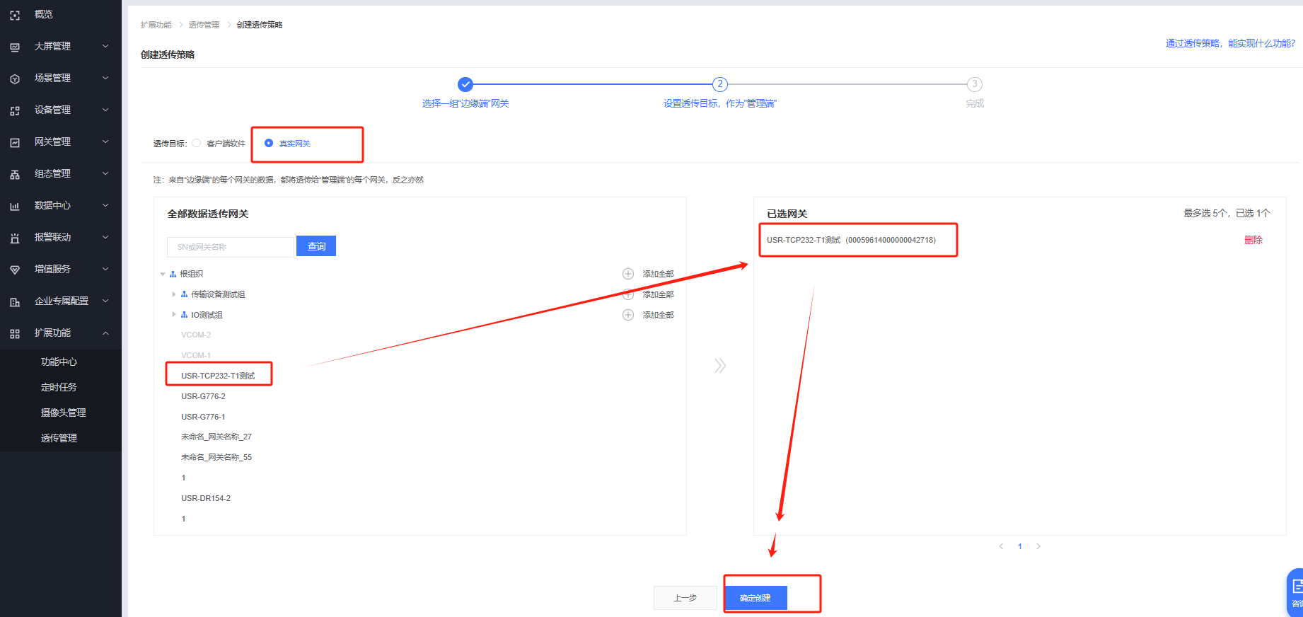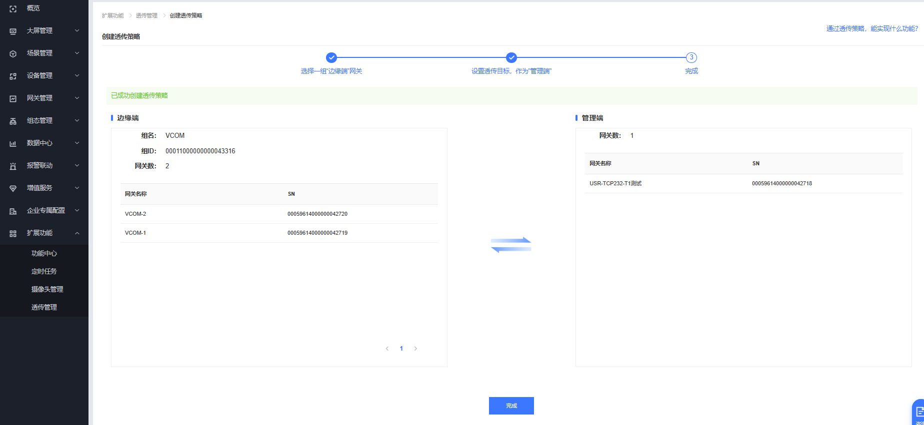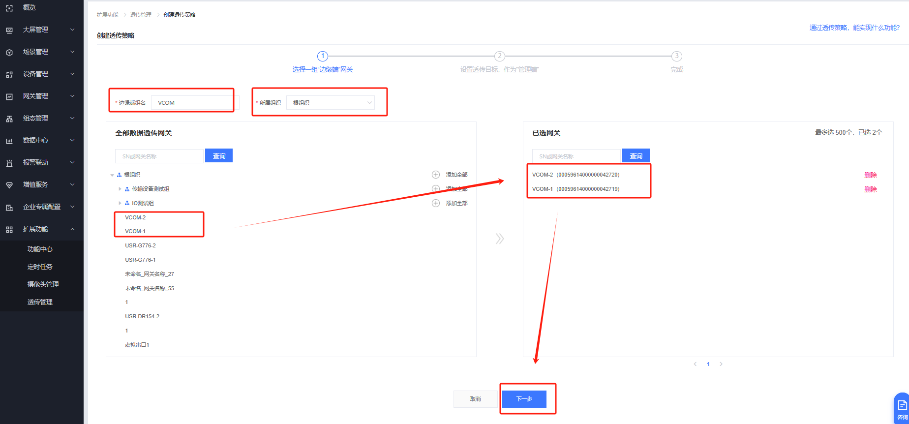 有人云--網關管理--網關列表--添加:VCOM-1,根組織,“SN不支持,點這里”,開啟有人云透傳,點擊保存即可