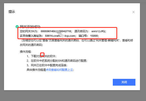 設備名稱可自定義,所屬組織選擇根組織,T1目前不支持SN碼添加,點擊右側“沒有SN,點這里”,設備ID和通訊密碼可以自動生成,設備ID20位,通訊密碼必須是8位(支持修改密碼),開啟有人云透傳。設置完成后點擊保存即可看到平臺給分配的接入地址和SN 密碼等信息。