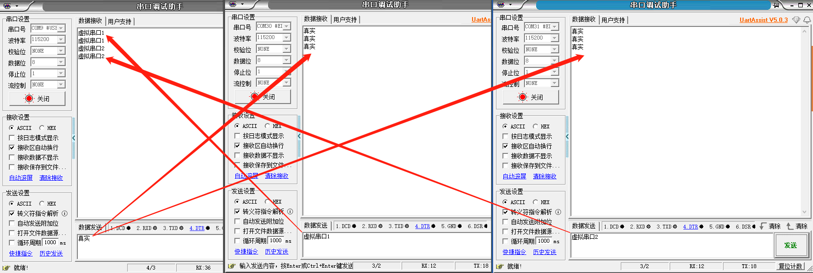 真實串口和虛擬串口1和虛擬串口2,進行數據傳輸