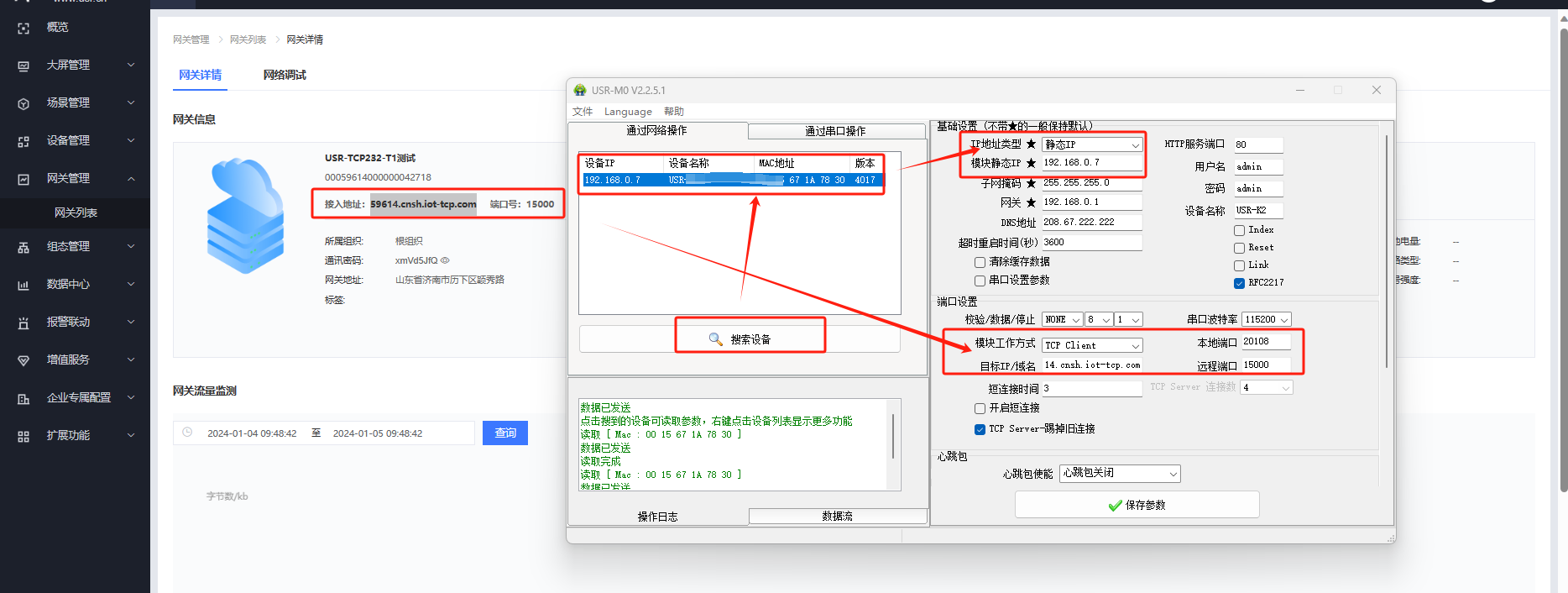 2)工作方式選擇TCP Client,目標ip: 59614.cnsh.iot-tcp.com,遠程端口號:15000,注冊包選用啟用透傳云,設備編號和通訊密碼可以在有人云平臺設備列表中的查看中可以查看到。設置完成后點擊保存參數。