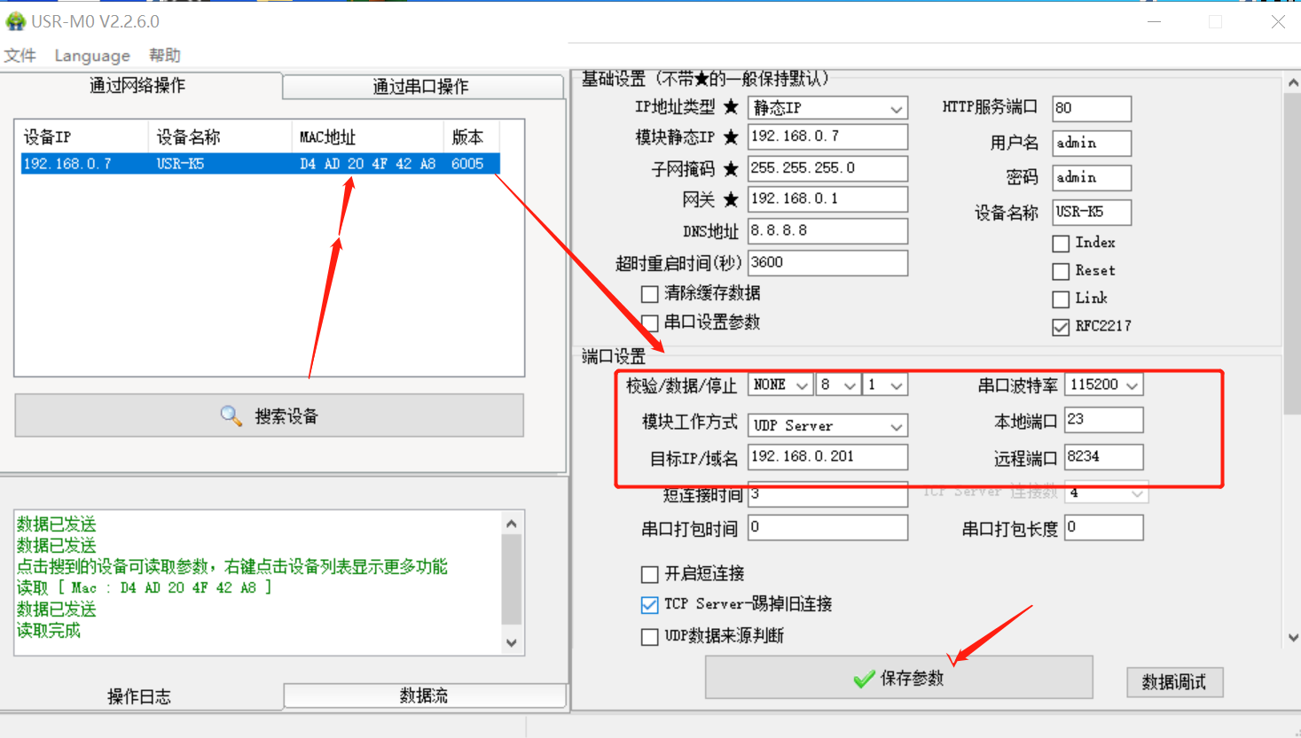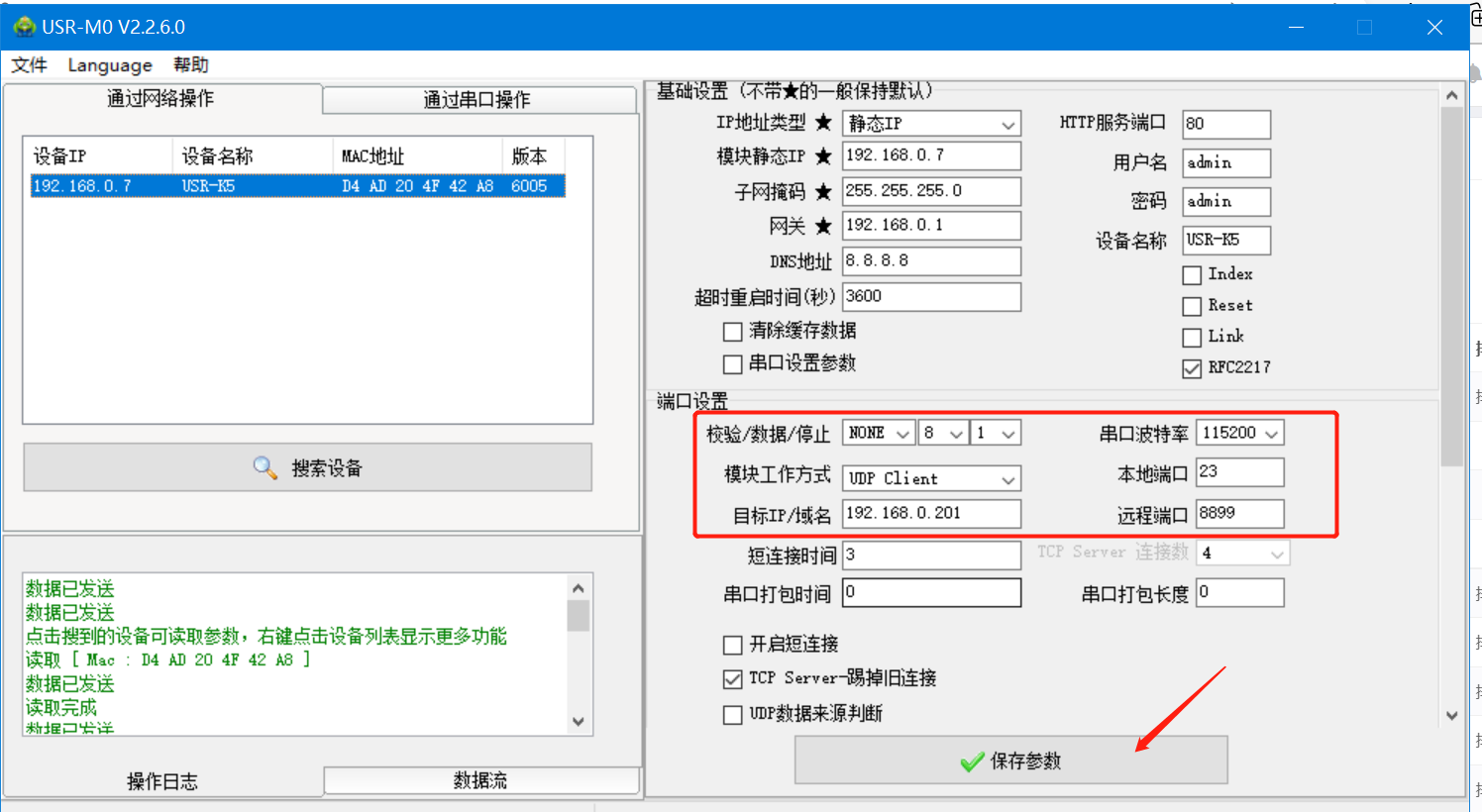 模塊工作方式:UDP Server,本地端口:23(可設),設置完參數后點擊保存參數。